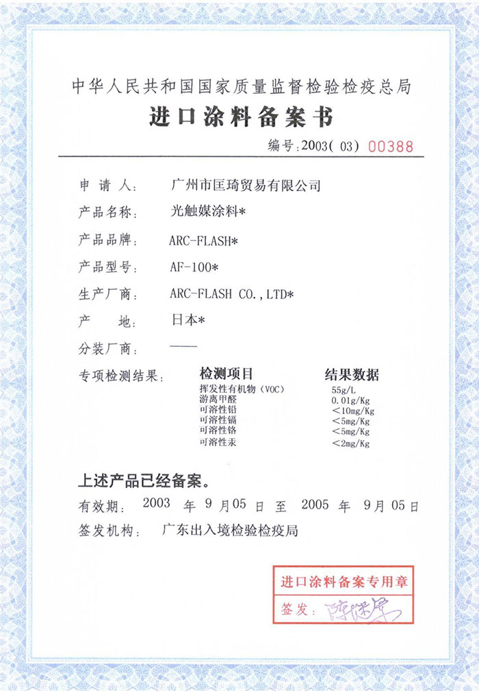 • 國家質檢總局進口涂料備案書